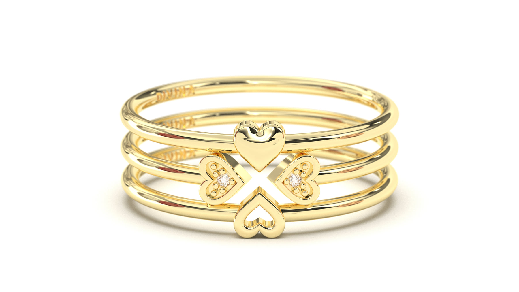 The only limit is your imagination. Mix, match, or wear solo these fine and elegant gold and diamond rings. Stackable Trio XX Ring, by DIVINA from our Mix & Match collection, featuring open design with two gold hearts and round white diamonds.